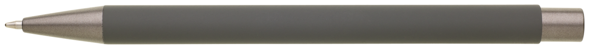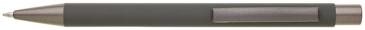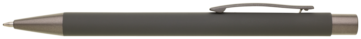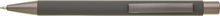 Kovová propiska CAGERI SOFT s hnědo-černými doplňky, s tmavě šedým pogumovaným povrchem. Velkoobsahová modrá náplň.