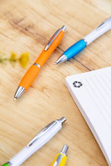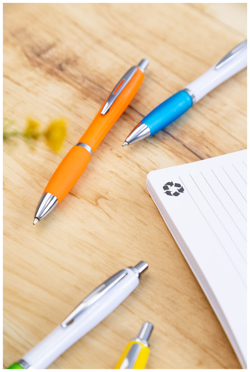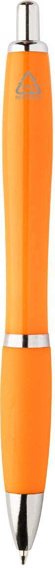 Kuličkové pero z recyklovaného ABS plastu s úchopem v odpovídající barvě a chromovanými částmi. S modrou náplní.