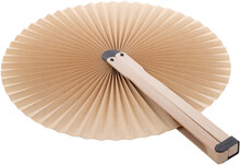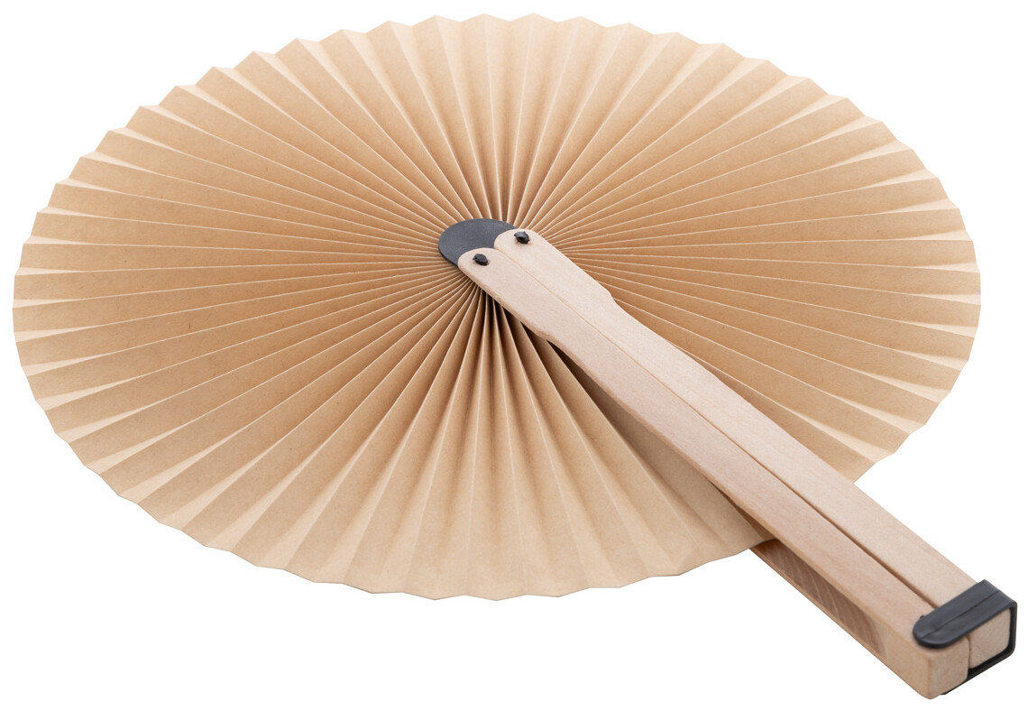 Vějíř z kraftového papíru s dřevěnou rukojetí.