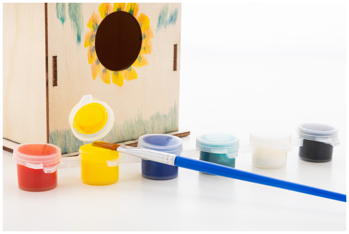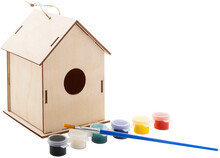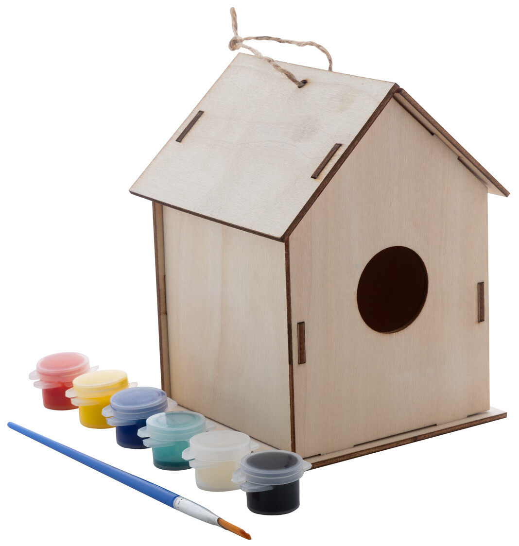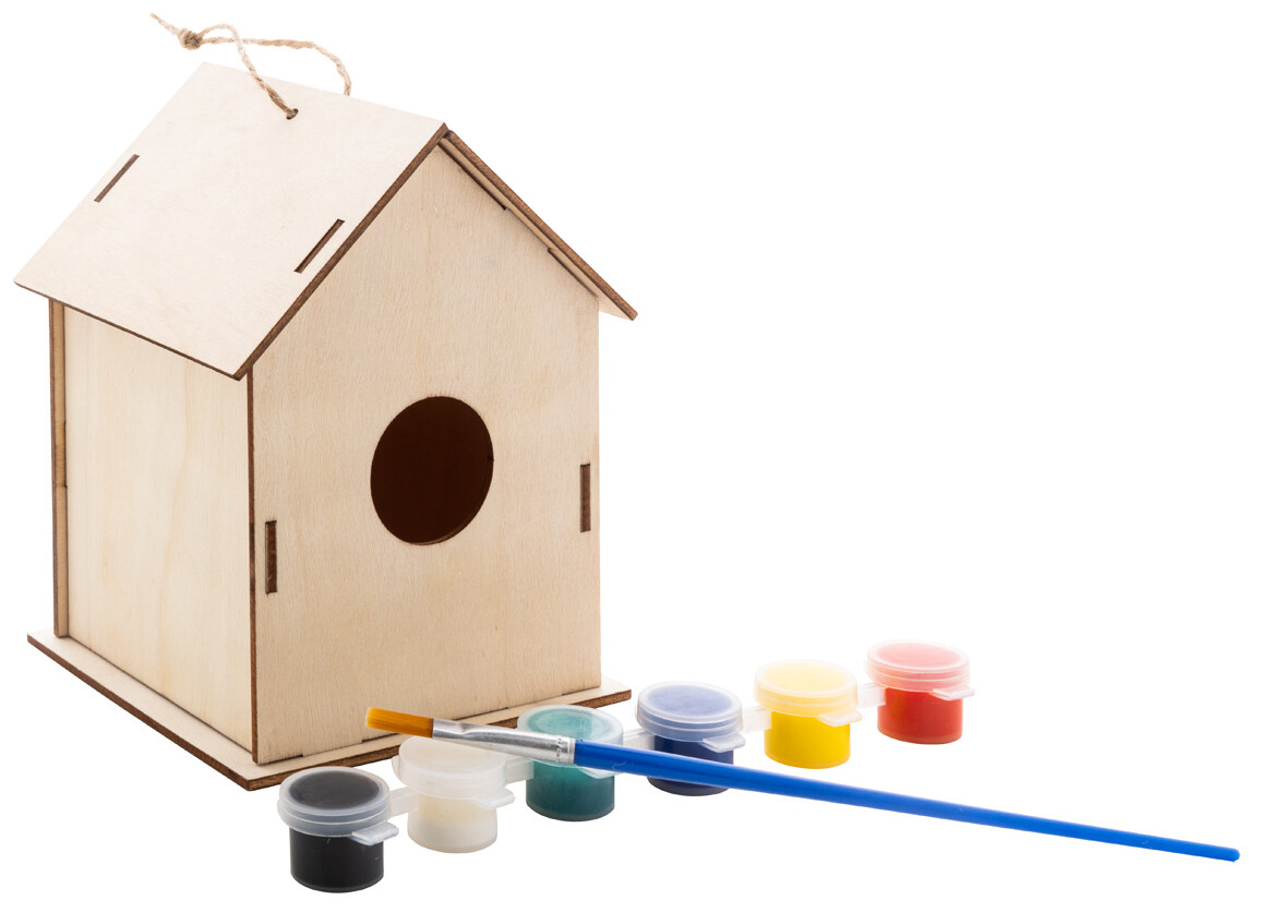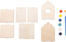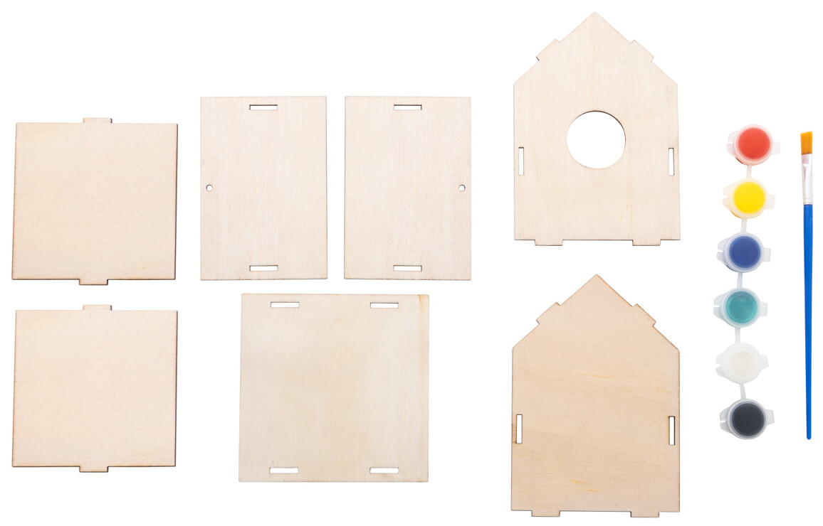 Dřevěná DIY ptačí budka se sadou akvarelů (se štětcem a 6 barvami). Dodáváno rozložené.
