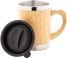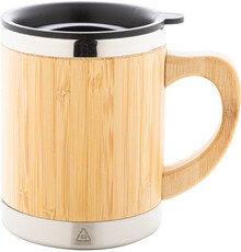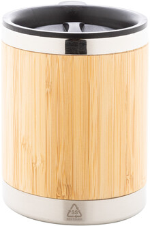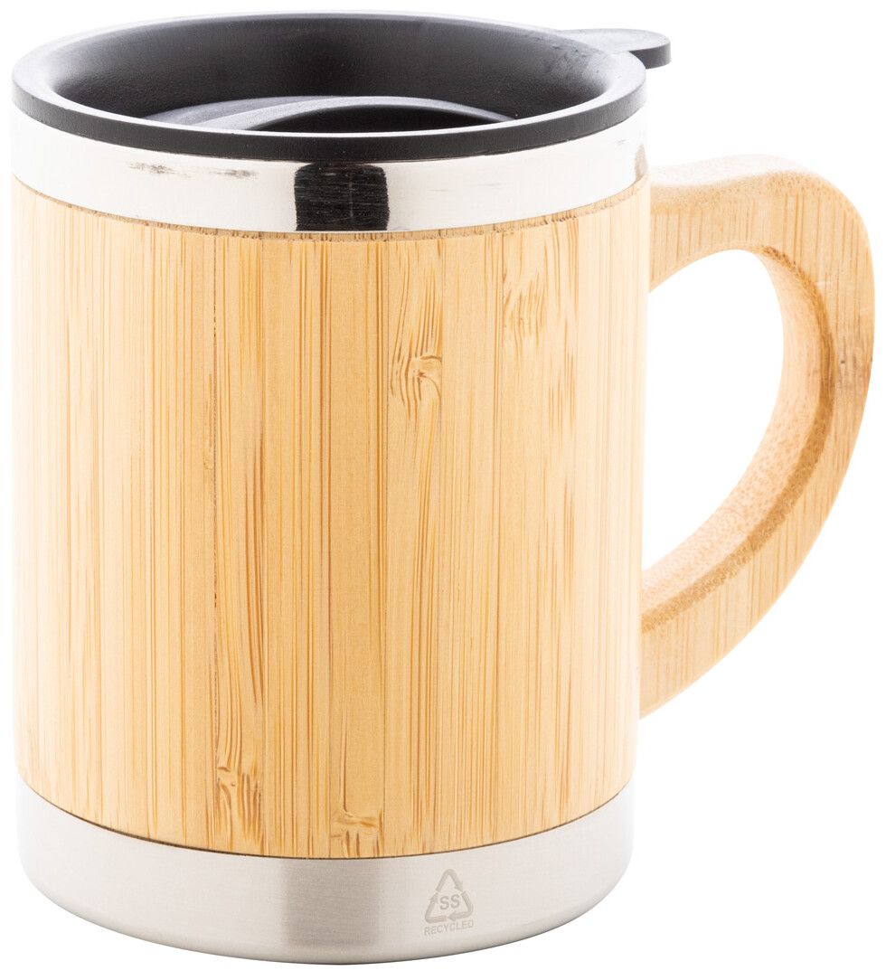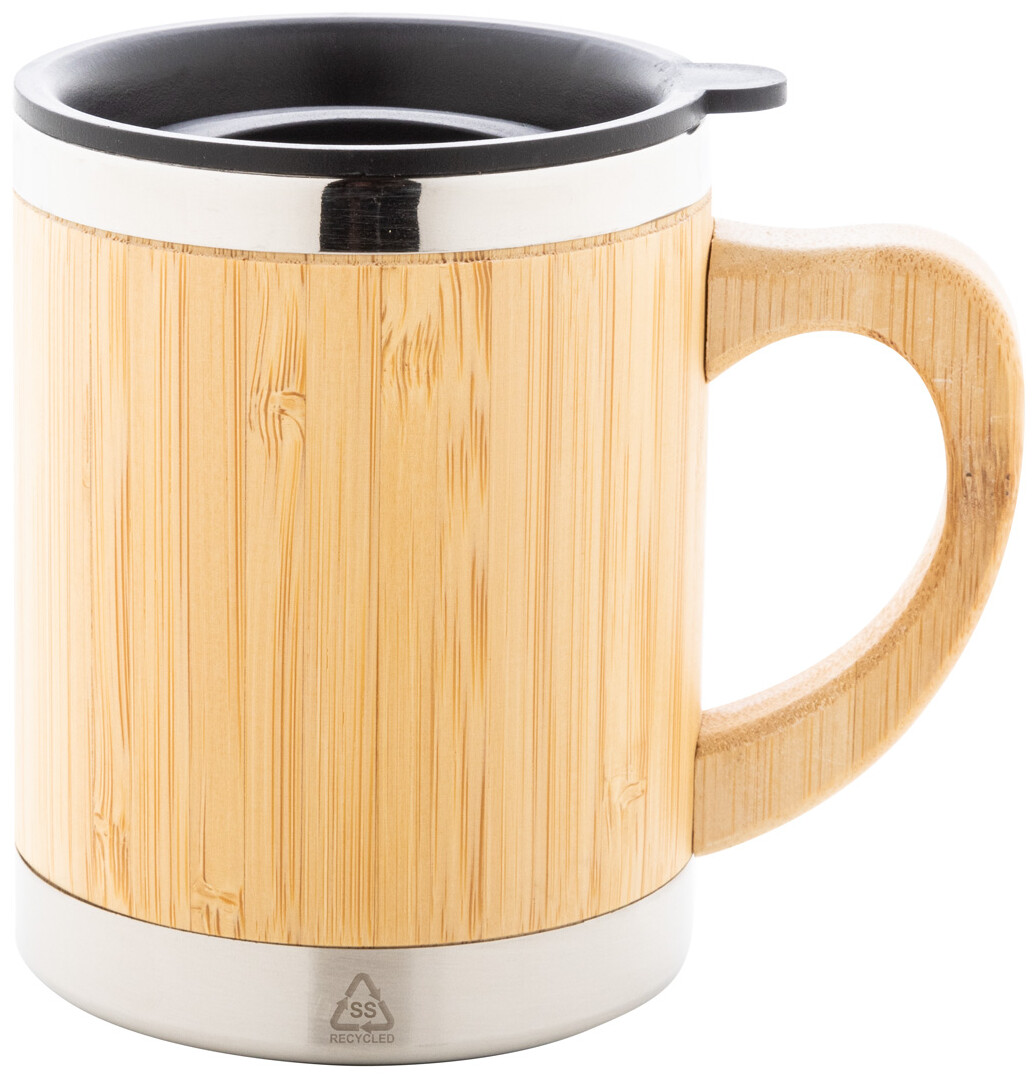 Bambusem potažený, dvoustěnný recyklovaný nerezový izolovaný termo hrnek s bambusovým uchem a PP víčkem na pití, 300 ml.
