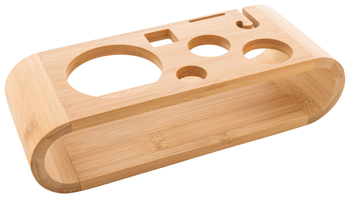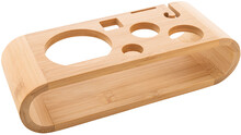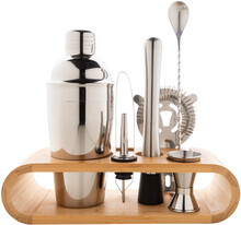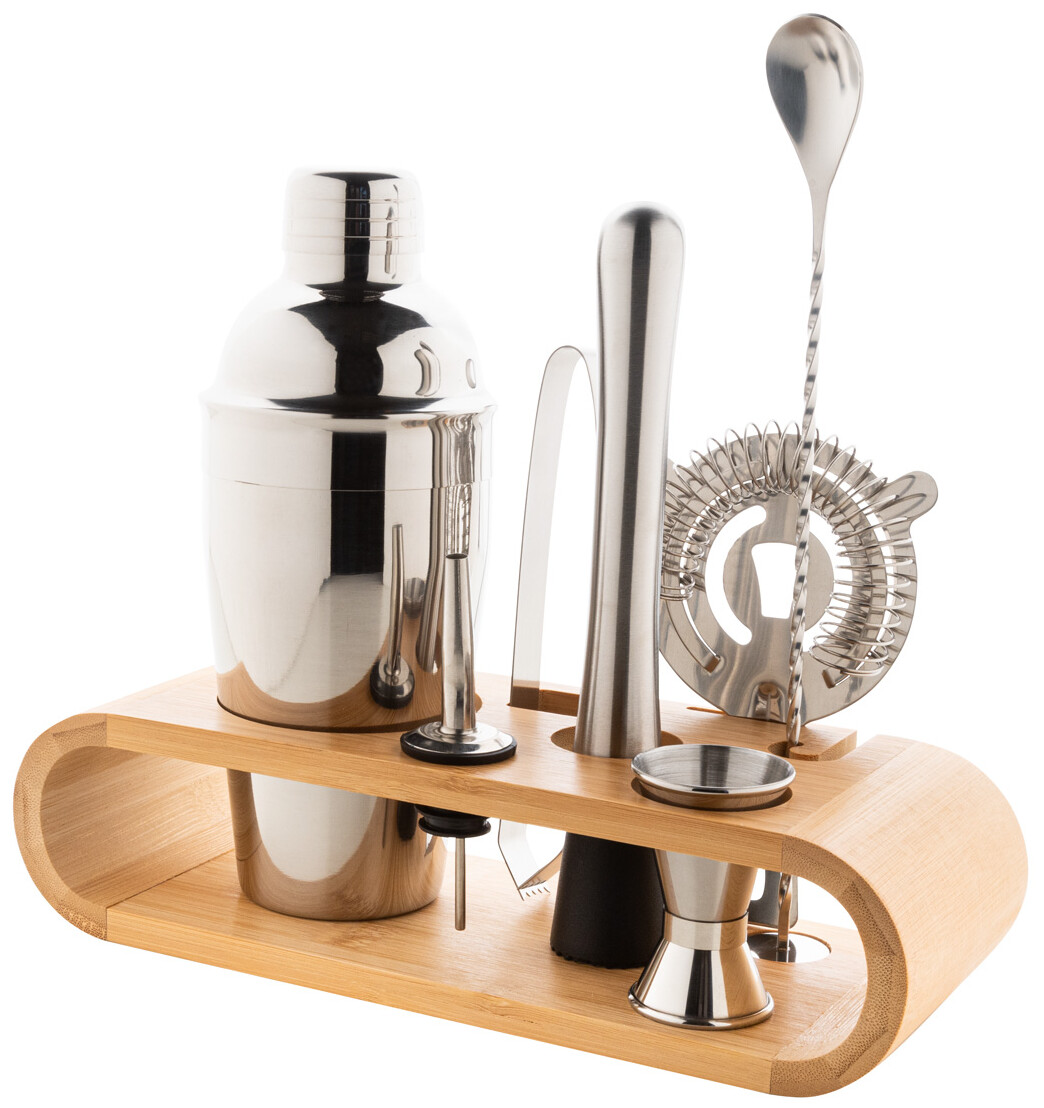 7dílná sada na koktejly z nerezové oceli v bambusovém stojanu. Obsahuje: šejkr na koktejly (550 ml), odměrku, sítko, barovou lžičku, drtič, kleště na led a nálevku.