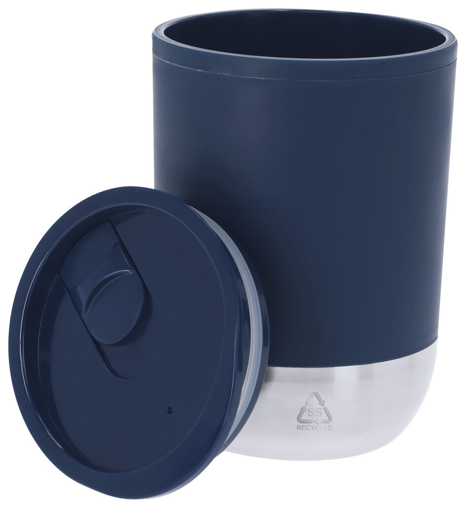 Dvoustěnný termo hrnek s PP plastovou izolací se dnem z recyklované nerezové oceli a víčkem na pití. 300 ml.