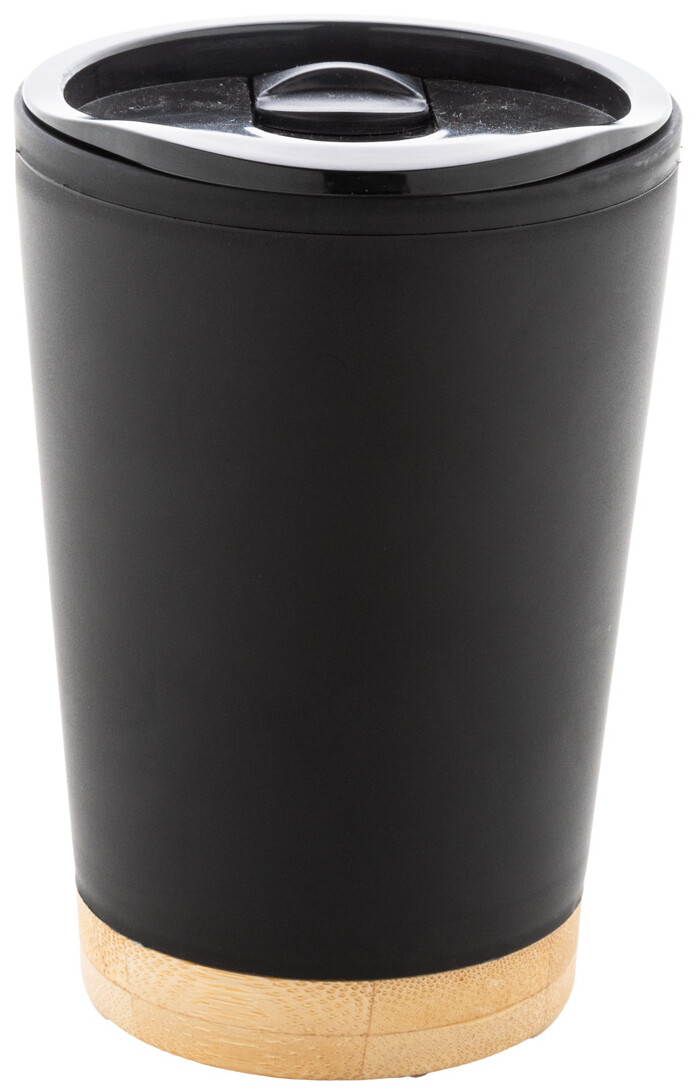 Dvoustěnný termo hrnek izolovaný PP plastem s víčkem na pití a bambusovým dnem, 260 ml.