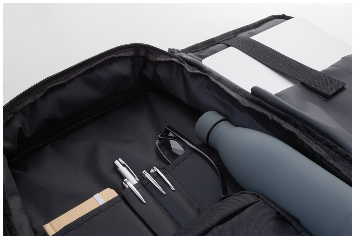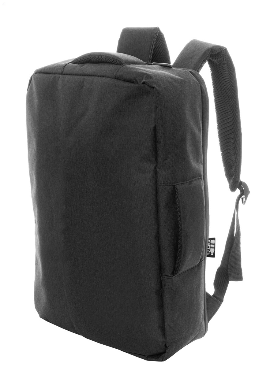 Dvojfunkční RPET batoh a taška na dokumenty s přihrádkou na zip a polstrovanou přihrádkou na notebook (15"). S popruhem na vozík, polstrovanými zády a ramenními popruhy. Polyester 300D RPET, s výrazným štítkem RPET.