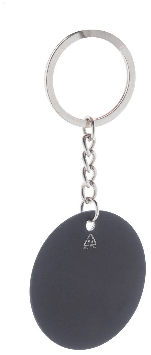 Kulatý přívěsek na klíče z recyklované nerezové oceli s pogumovaným povrchem. Se speciální vrstvou pro zrcadlové laserové gravírování.