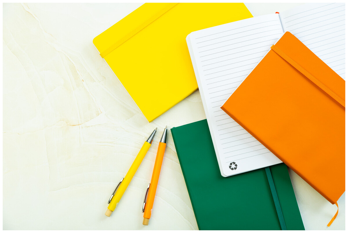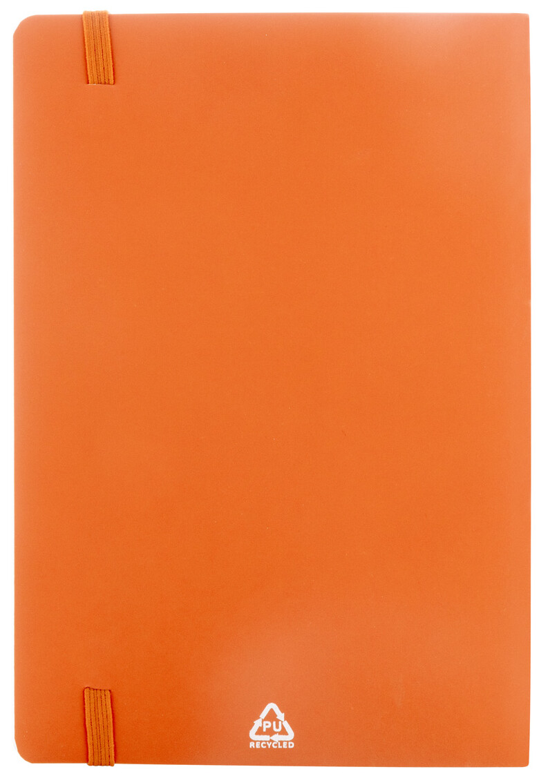 Blok A5 z recyklované PU kůže s měkkou vazbou s 80 linkovanými listy z recyklovaného papíru. Se záložkou v odpovídající barvě a gumičkou.