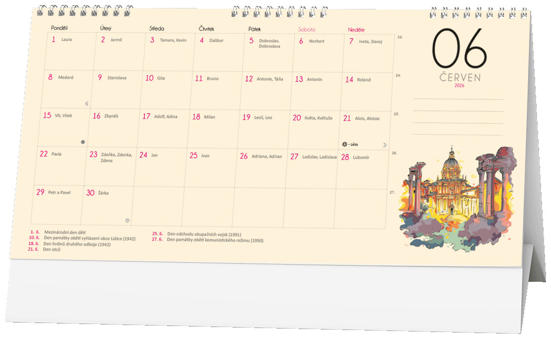 Výjimečný stolní kalendář s měsíčním kalendáriem, laděný do jemných barevných tónů s prostorem pro poznámky a plánování.