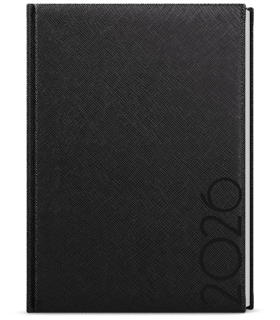 Týdenní diář v černé barvě se strukturovaným povrchem. Moderní doplněk v oblíbeném formátu. Diář má velký prostor pro poznámky a plánování.