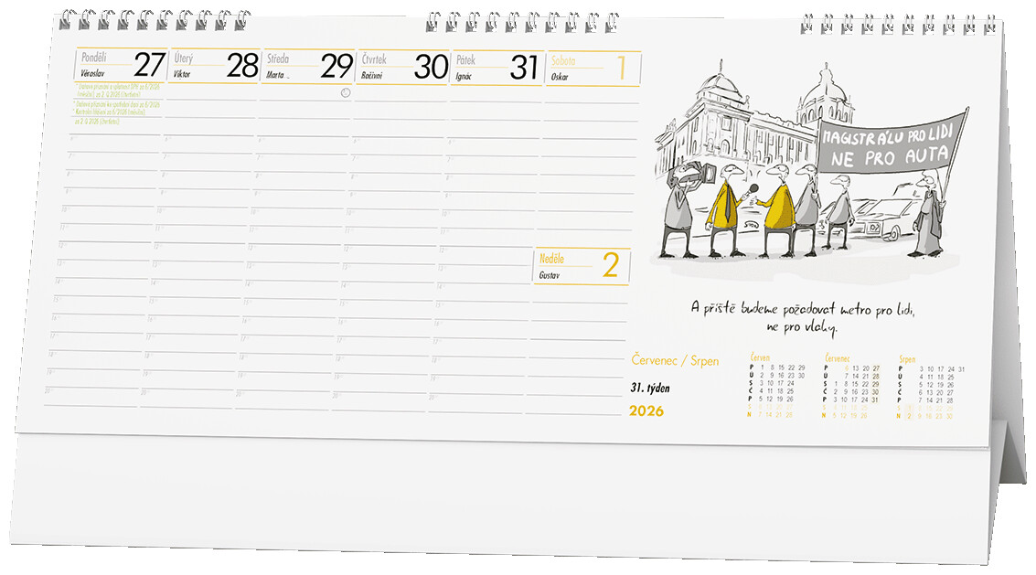 - měsíční fáze, roční období, letní a zimní čas, mezinárodní svátky CZ, SK, PL, A, D, daňové termíny CZ, tabulkový přehled 3 měsíců, kreslený vtip na každý týden, časové plánování