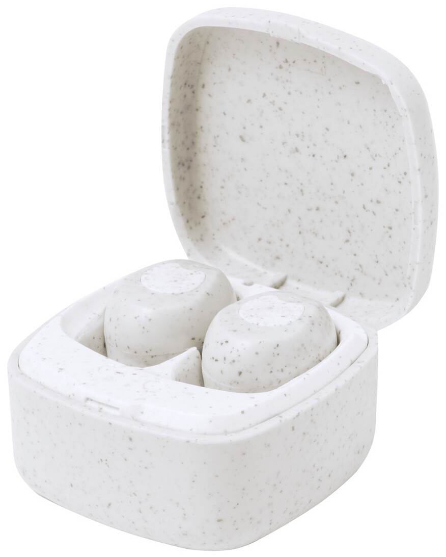 Ekologická plastová sluchátka s pšeničnou slámou, skutečně bezdrátová stereofonní sluchátka (TWS) s funkcí handsfree volání v nabíjecím pouzdře. Včetně nabíjecího kabelu USB.