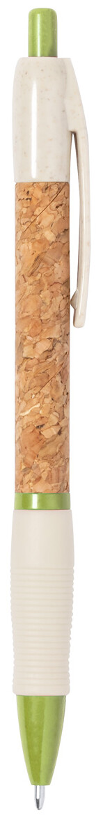 Ekologické plastové kuličkové pero z pšeničné slámy s pouzdrem potaženým přírodním korkem a pryžovým úchopem. S modrou náplní.