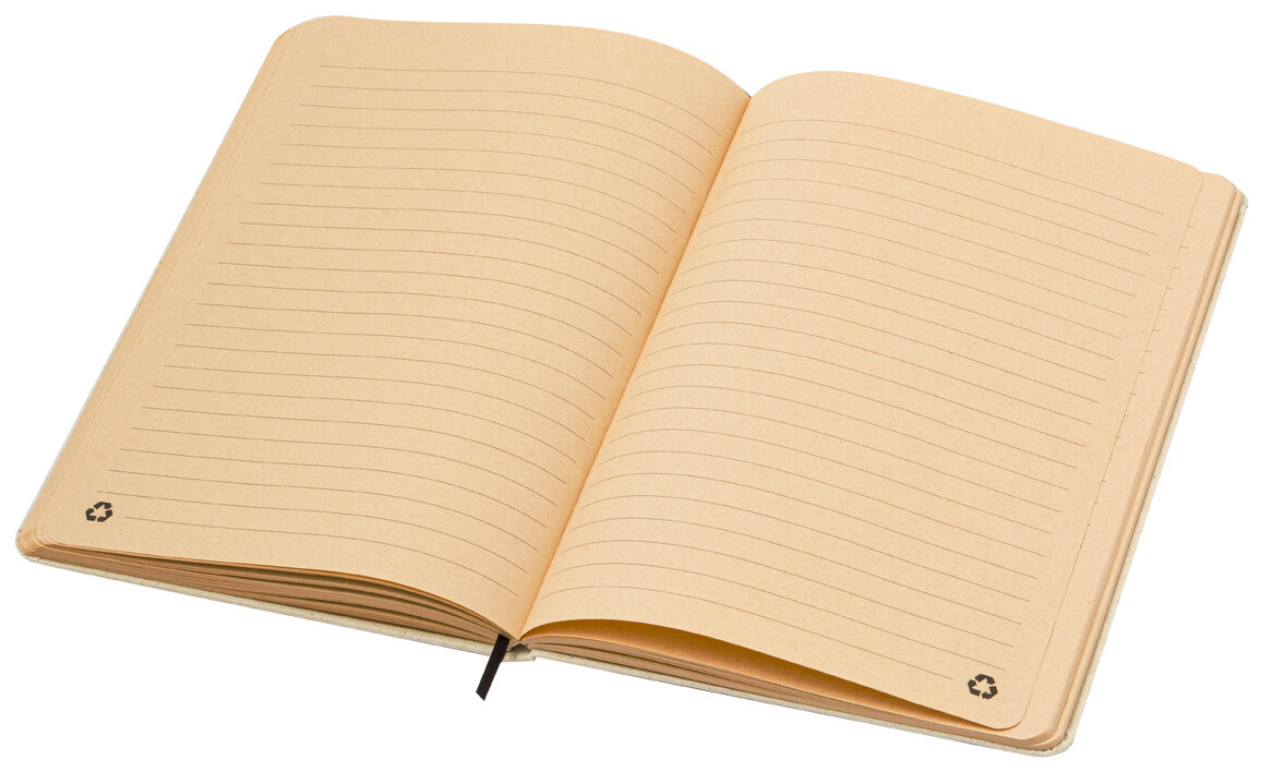 Blok A5 z travního papíru s 80 linkovanými listy. Se záložkou a gumičkou.