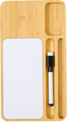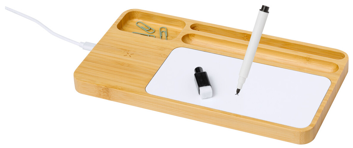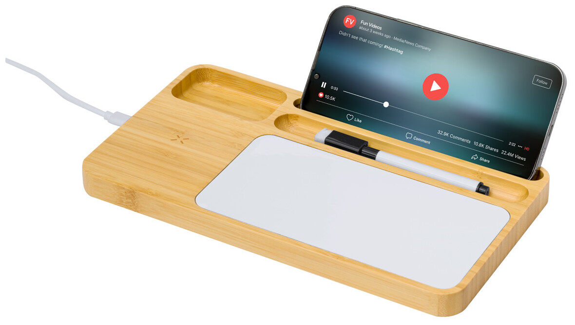 Bambusový stolní organizér a držák na mobil s povrchem tabule a vestavěnou bezdrátovou rychlonabíječkou (15W). Včetně fixu s gumou a USB nabíjecího kabelu.