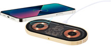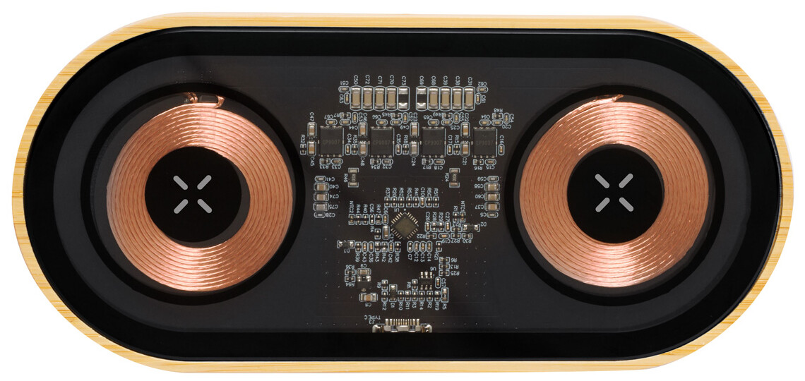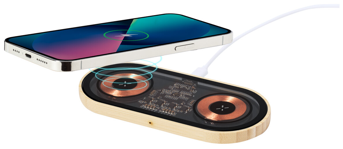 Dvoucívková bezdrátová rychlonabíječka (15W) v bambusovém a průhledném plastovém krytu s viditelnými elektronickými součástkami. Včetně USB nabíjecího kabelu.