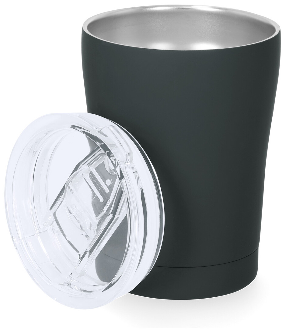 Dvoustěnný, nerezový izolovaný termo hrnek s pogumovanou úpravou a víčkem na pití, 350 ml.