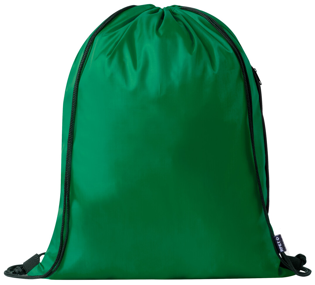 RPET stahovací taška s boční kapsou na zip, 210T RPET polyester s výrazným štítkem RPET.