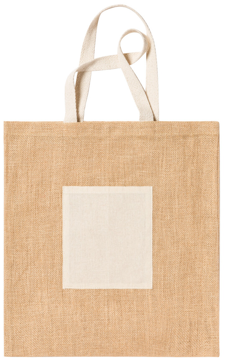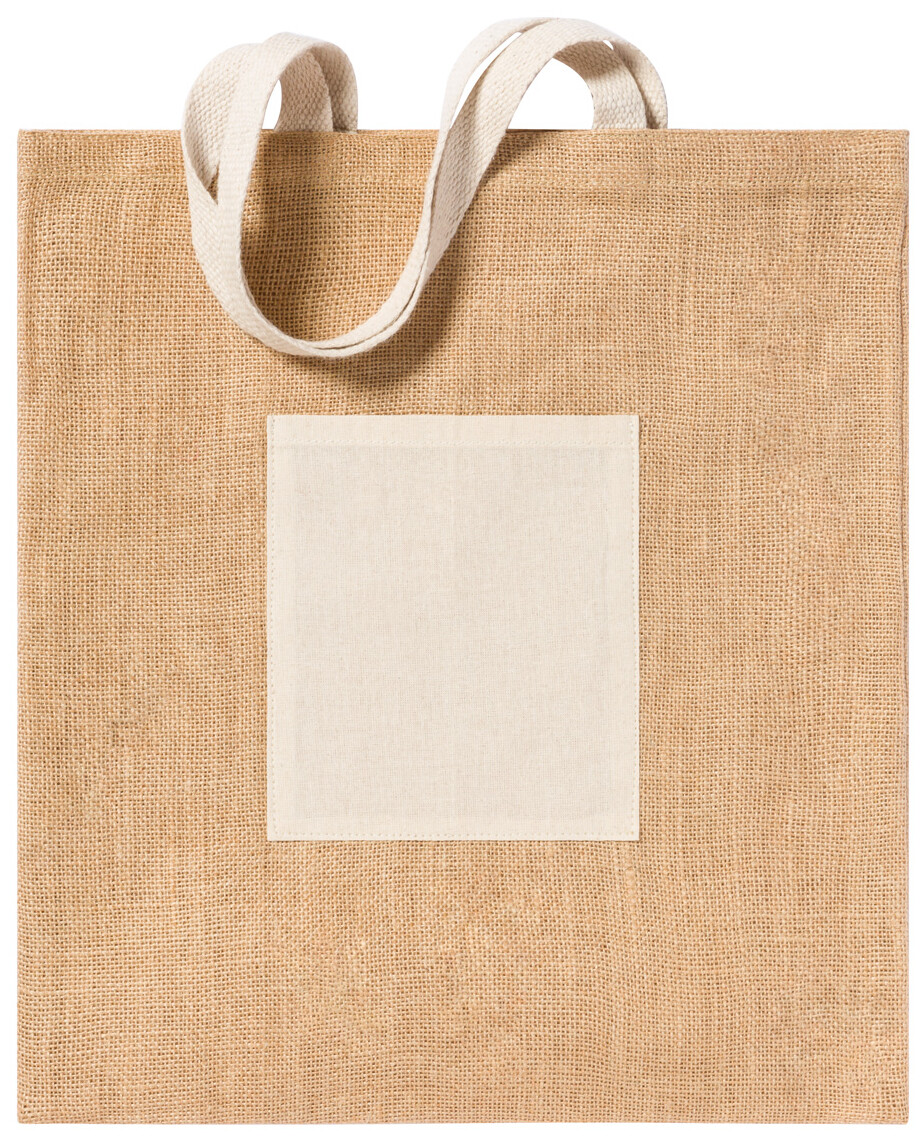 Jutová nákupní taška s bavlněnou kapsou a dlouhými uchy.