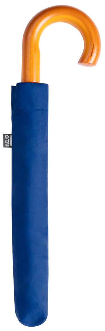 Automatický, větruodolný skládací deštník s 8 panely v pouzdru v odpovídající barvě. S kovovým rámem a dřevěnou rukojetí. Pongee 190T RPET. S výrazným štítkem RPET.
