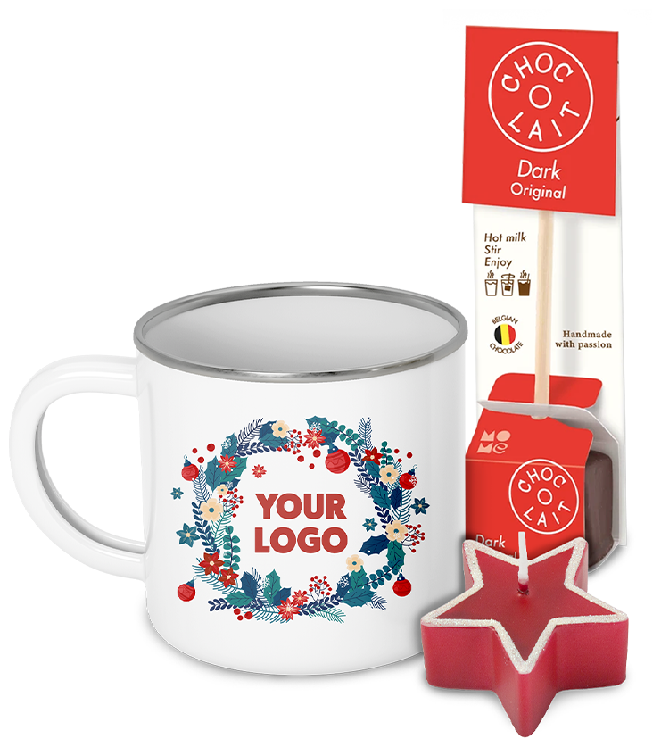 Smaltovaný plecháček, 200 ml, vč. plnobarevného potisku, Belgická čokoláda na tyčince, 1 porce, plovoucí svíčka ve tvaru hvězdy, 60x30 mm - různé barvy