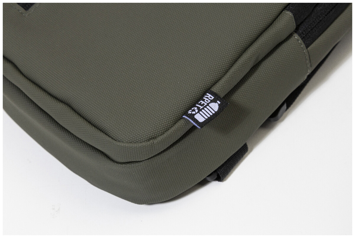 Voděodolná RPET crossbody taška na zavěšení přes rameno s kapsami na zip, zapínáním na přezku a polstrovanými zády. S nastavitelným ramenním popruhem vybaveným polohami na levé a pravé straně. Polyester RPET 600D potažený PU, s výraznou etiketou RPET.