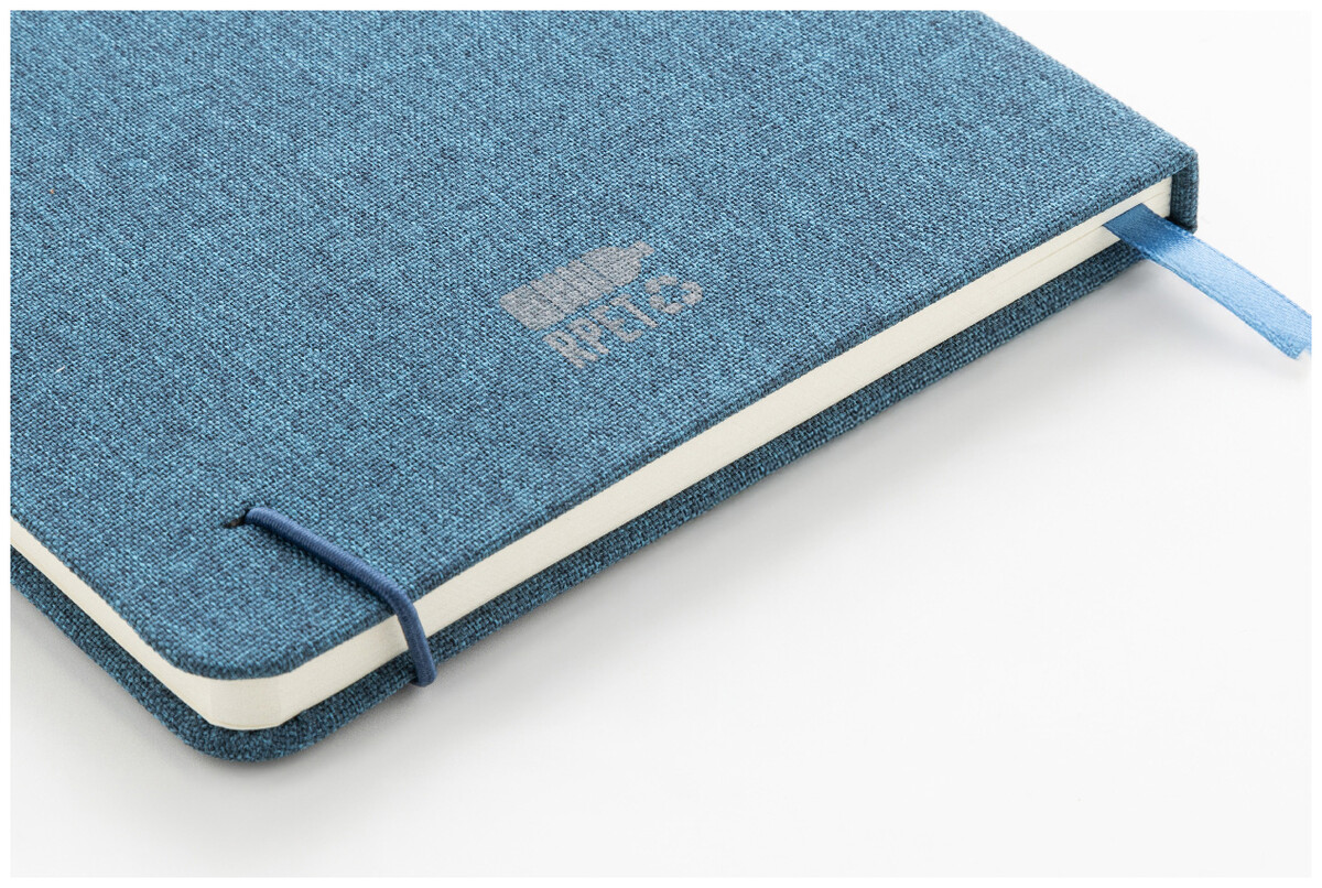 Blok A5 potažený polyesterem 300D RPET s 80 čistými listy. S gumovým páskem, záložkou a držákem na pero.
