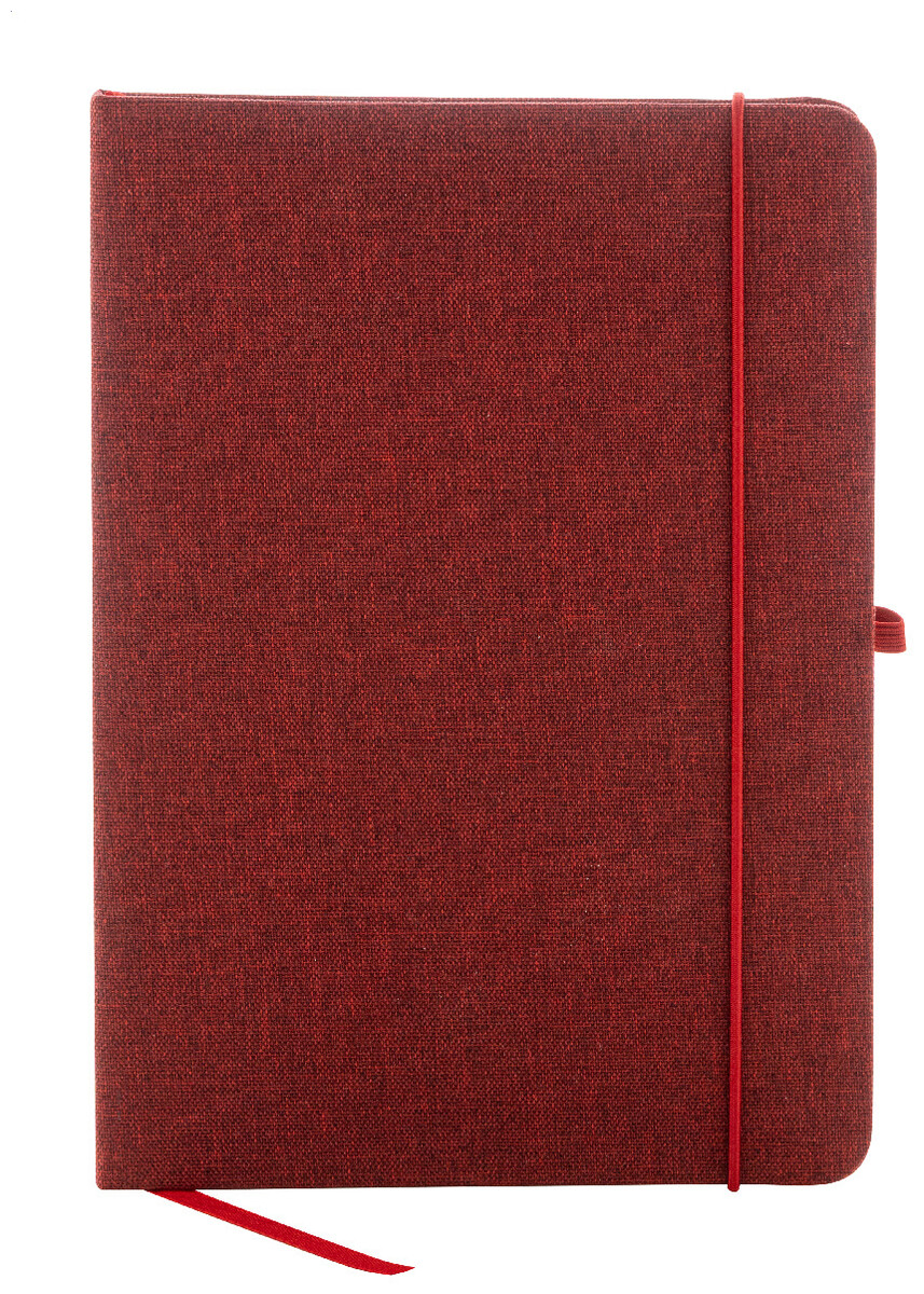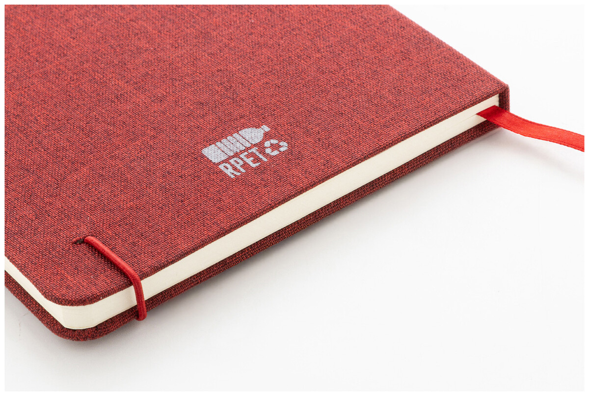 Blok A5 potažený polyesterem 300D RPET s 80 čistými listy. S gumovým páskem, záložkou a držákem na pero.