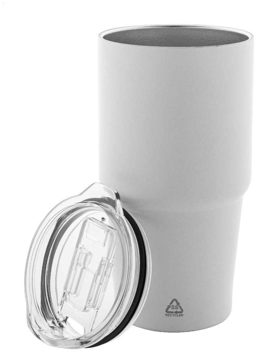 Dvoustěnný vakuově izolovaný termohrnek z recyklované nerezové oceli s víčkem z polystyrenového plastu. 600 ml.