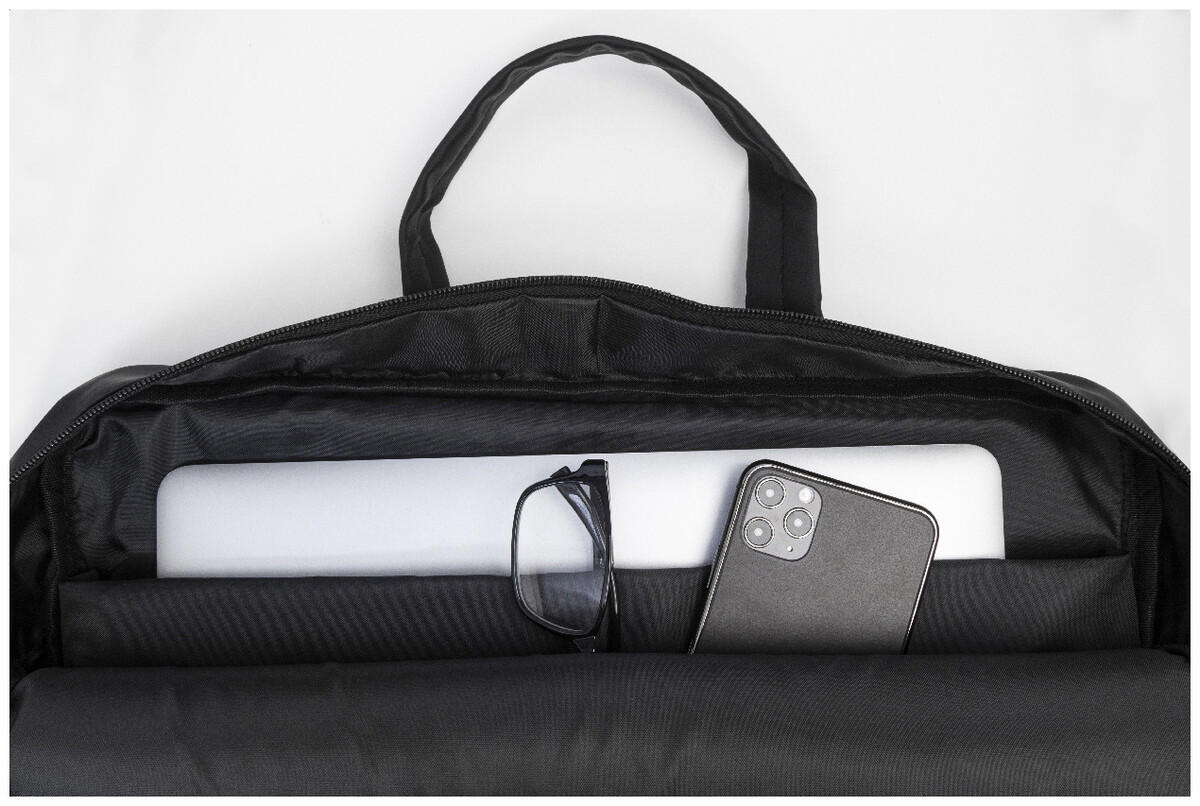 Voděodolná brašna na dokumenty a notebook z měkké recyklované PU kůže s přihrádkou na zip, přední kapsou na zip, nastavitelným ramenním popruhem a polstrovanou přihrádkou na notebook (15"). S výrazným štítkem z recyklované PU.