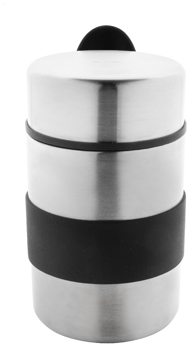 Dvoustěnná, vakuově izolovaná nádoba na jídlo z recyklované nerezové oceli se silikonovým úchopem a PP lžičkou. 450 ml.