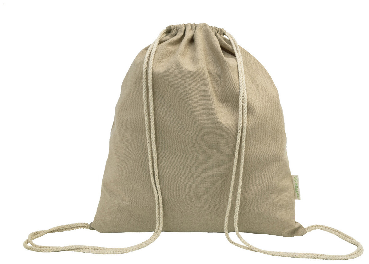 Vak se stahovací šňůrkou ze 70 % recyklované bavlny a 30 % polyesteru RPET, 140 g/m2. S výrazným štítkem z recyklované bavlny.