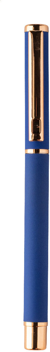 Sada per z recyklovaného hliníku s kuličkovým perem a rollerem s pogumovaným povrchem a detaily růžového zlata. S modrou náplní. Se speciálním povrchem pro zrcadlové laserové gravírování v růžovo-zlaté barvě. V černé papírové dárkové krabičce.