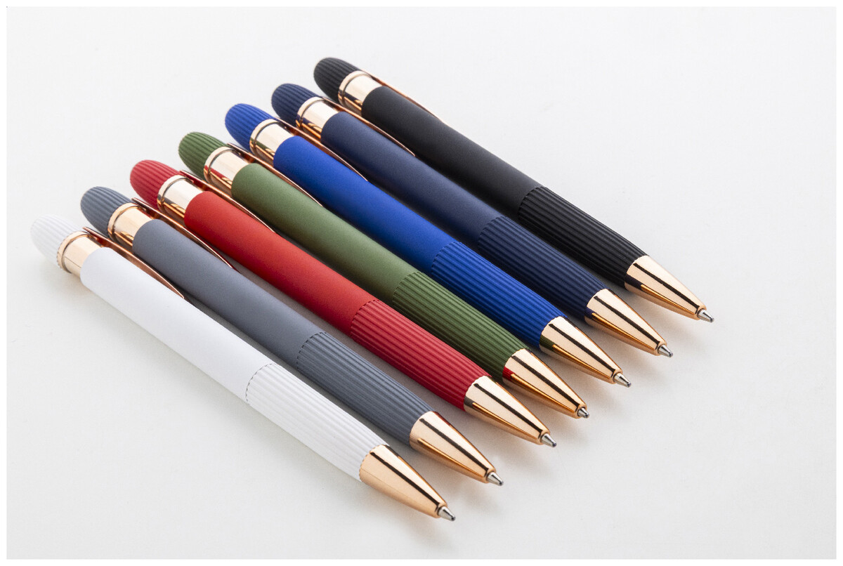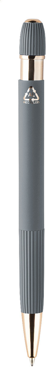 Kuličkové pero z recyklovaného hliníku s pogumovaným tělem a detaily v růžovo-zlaté barvě. Se speciálním povlakem pro zrcadlové laserové gravírování v růžovo-zlaté barvě. S modrou náplní.