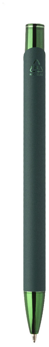 Kuličkové pero z recyklovaného hliníku s pogumovaným tělem a barevnými lesklými kovovými díly. Se speciálním povrchem pro zrcadlové gravírování, které odpovídá kovovým částem. S modrou náplní.