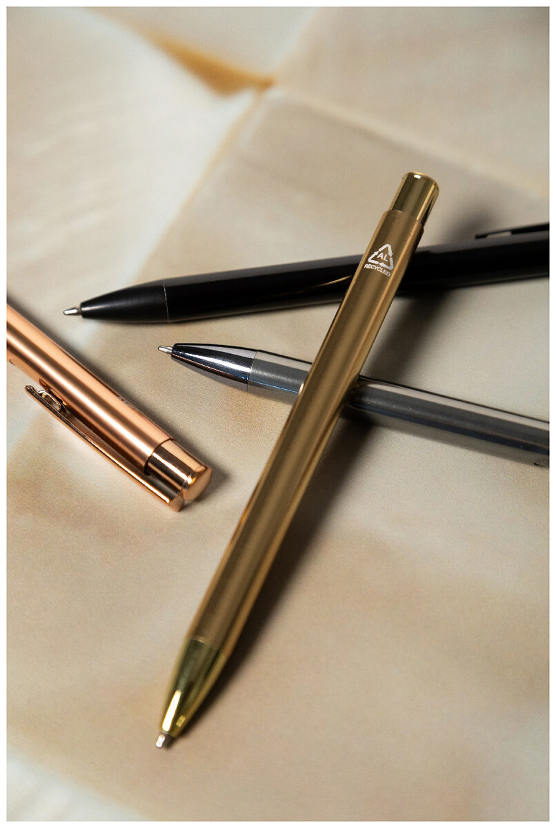 Kuličkové pero z recyklovaného hliníku s lesklým kovovým povrchem. S modrou náplní.