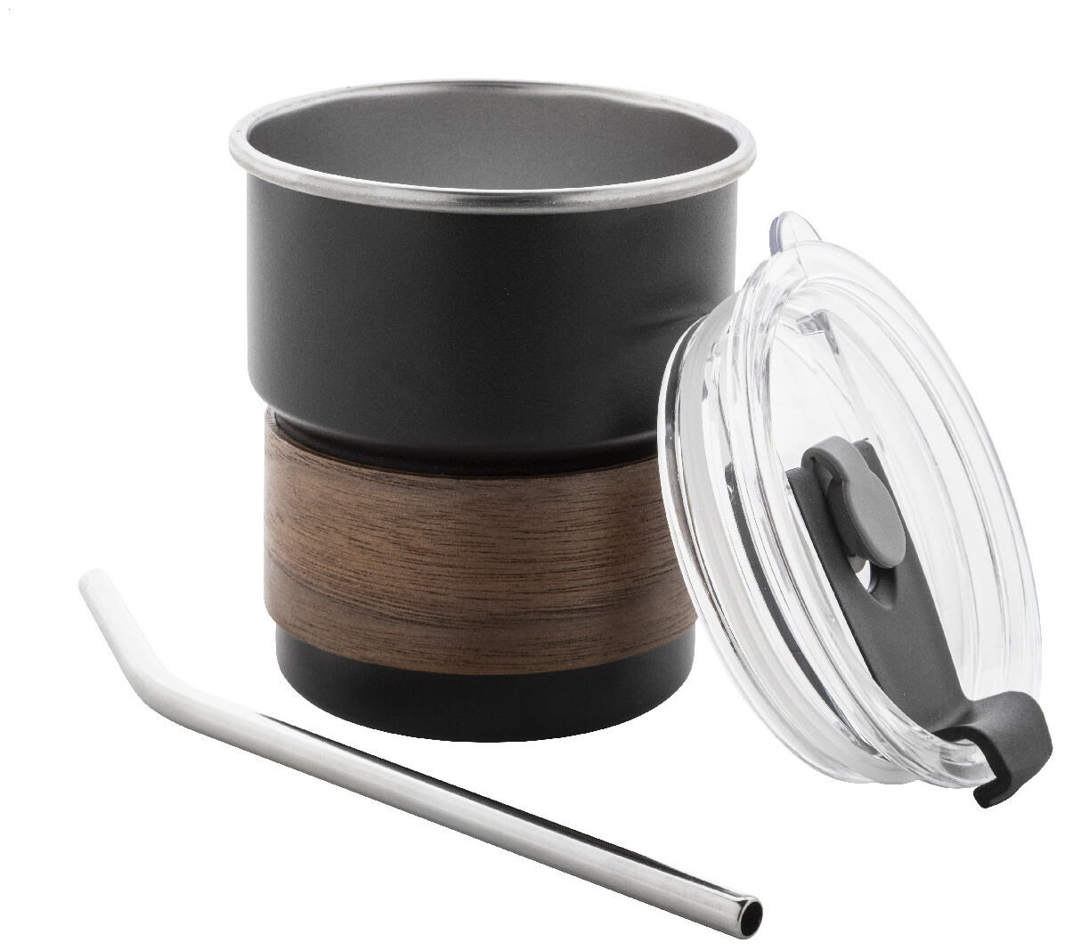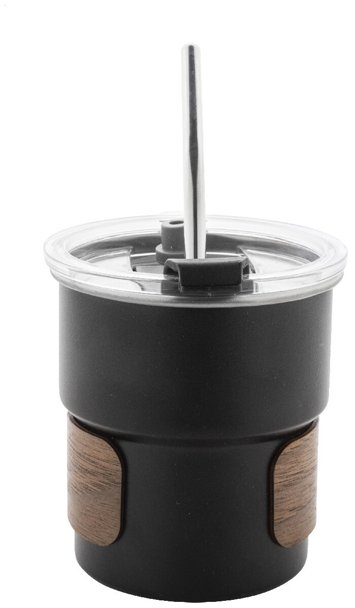 Jednostěnný cestovní hrnek z recyklované nerezové oceli s úchopem z ořechového dřeva, plastovým víčkem a brčkem z recyklované nerezové oceli. 260 ml.