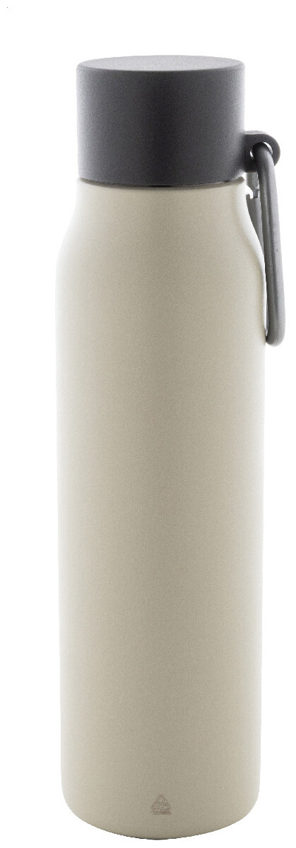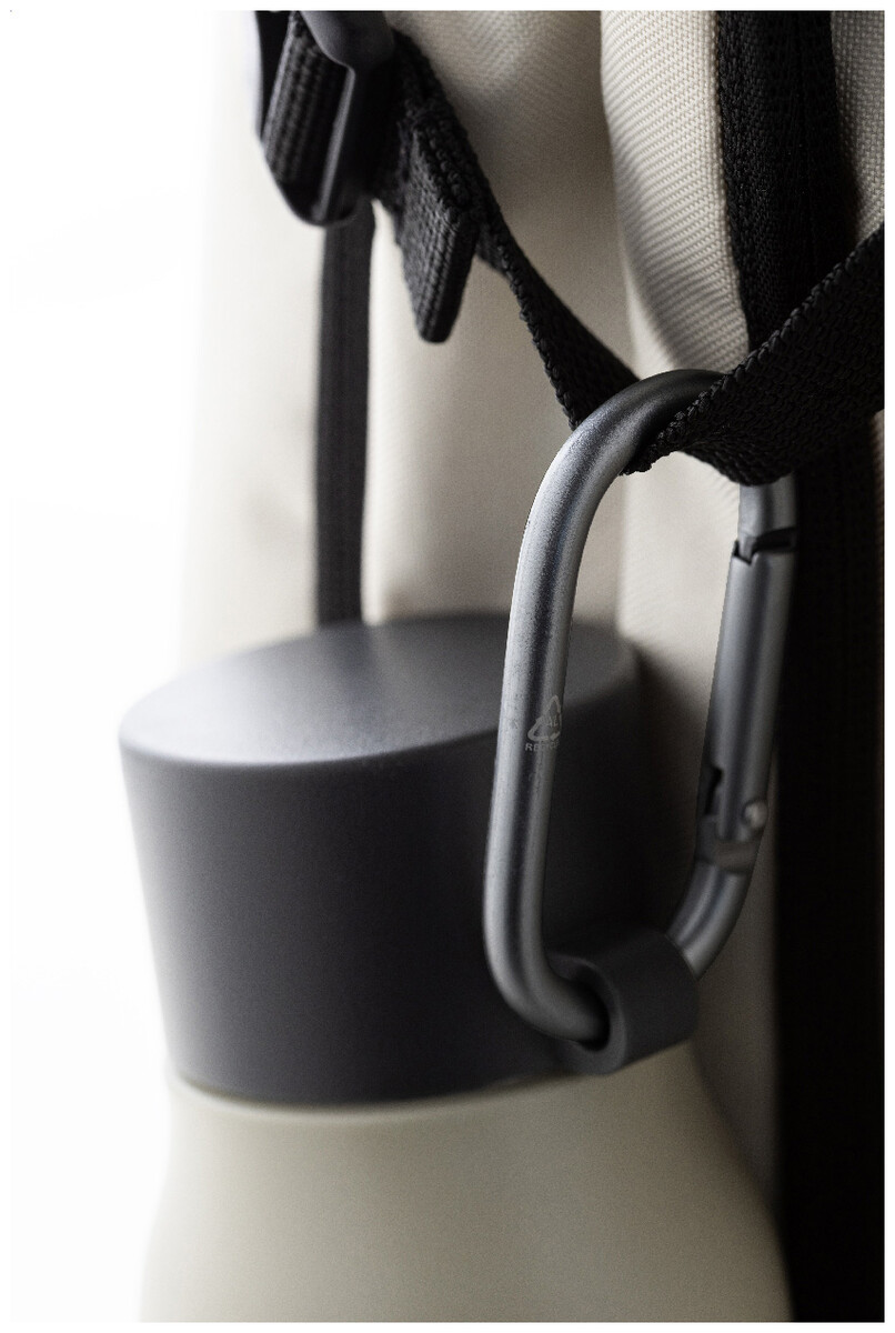 Dvoustěnná vakuová láhev z recyklované nerezové oceli s víčkem z PP a karabinou z recyklovaného hliníku. 500 ml.