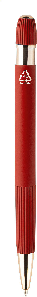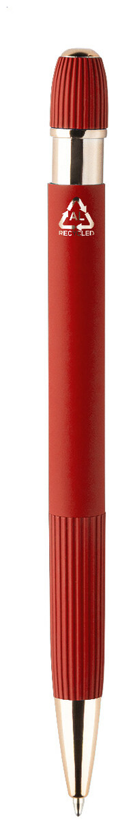 Kuličkové pero z recyklovaného hliníku s pogumovaným tělem a detaily v růžovo-zlaté barvě. Se speciálním povlakem pro zrcadlové laserové gravírování v růžovo-zlaté barvě. S modrou náplní.