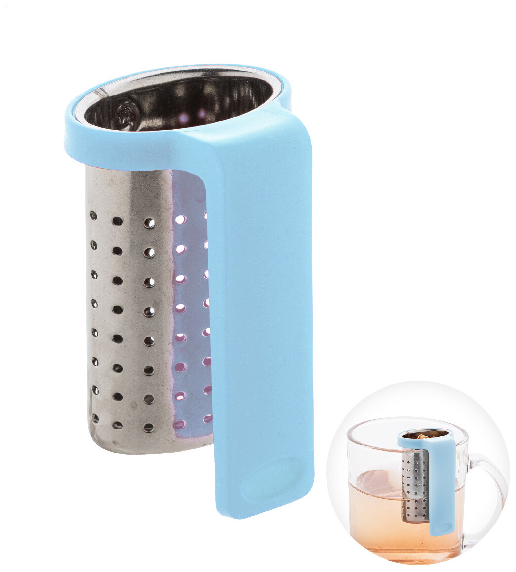 Nerezové sítko na čaj s praktickým klipem z recyklovaného ABS plastu. Navržen pro snadné připevnění k okraji hrnku.