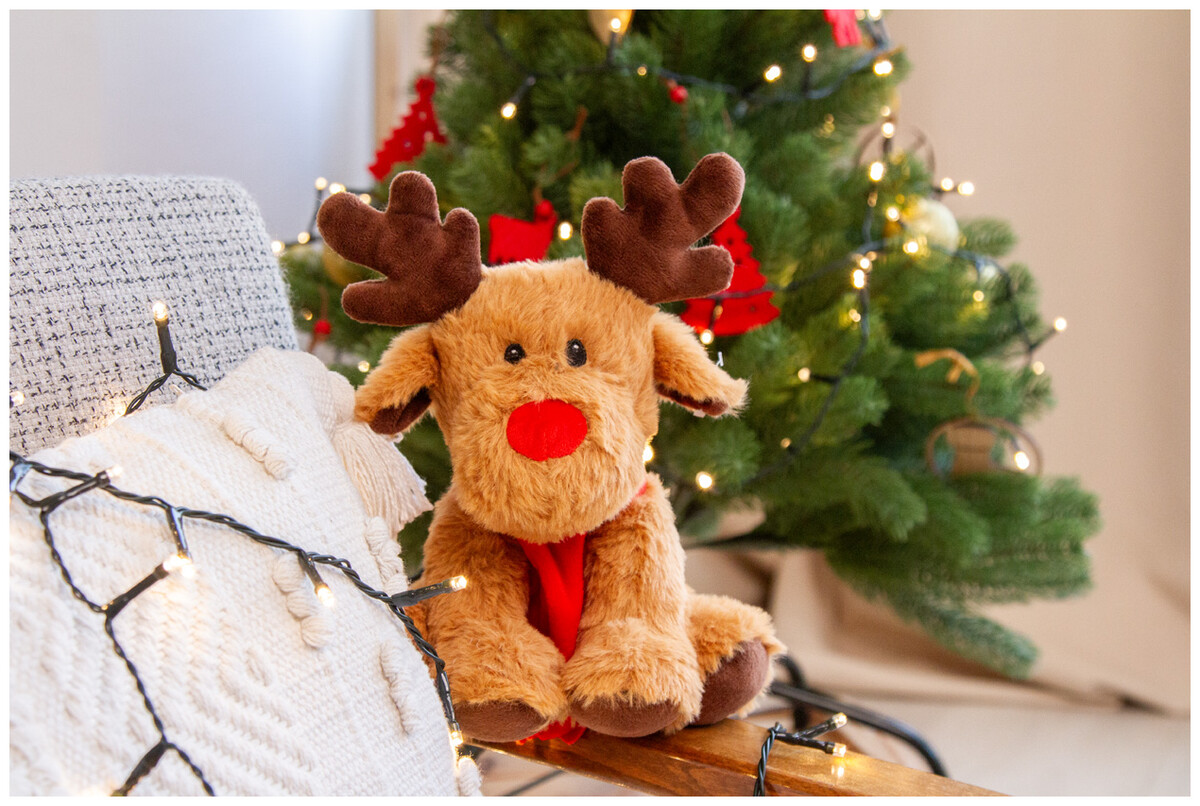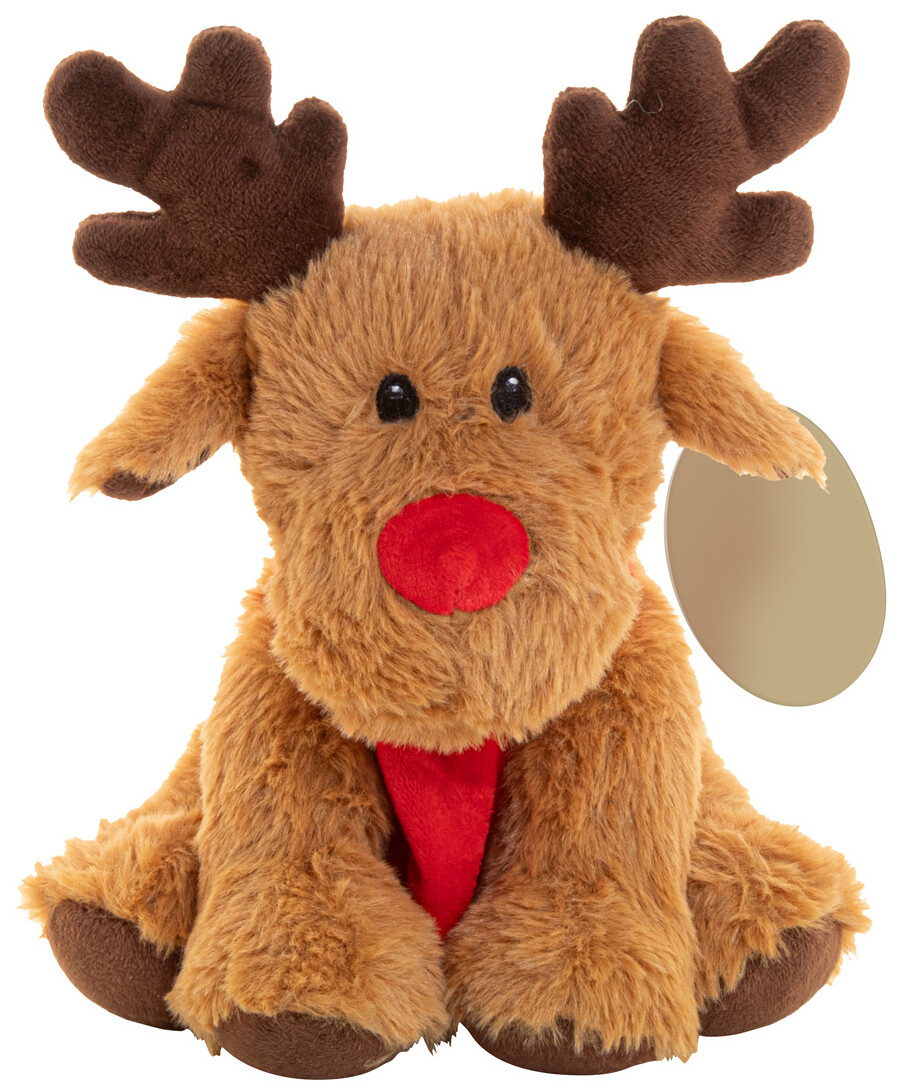 RPET plyšový vánoční sob se šálou. S tisknutelnou visačkou z kraftového papíru na uchu.