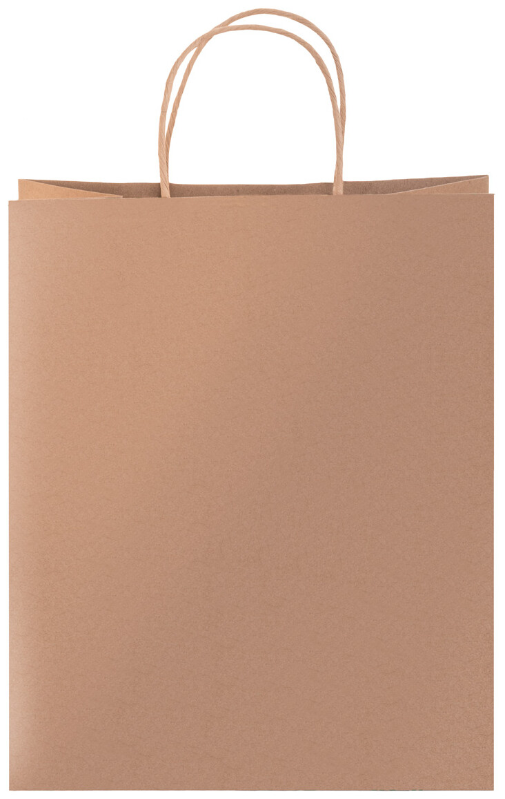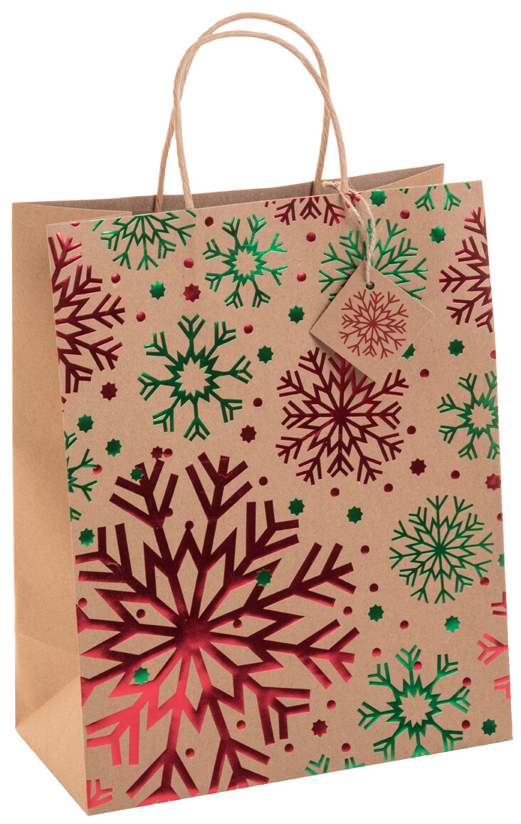Dárková taška z recyklovaného kraftového papíru s vánočním designem vyraženým fólií, kroucenými uchy a dárkovou visačkou. 140 g/m2.