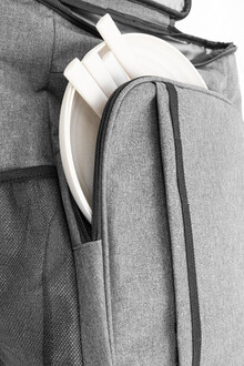Chladicí piknikový batoh z RPET s přední kapsou na zip a chladicí přihrádkou na zip s PEVA výplní. S bočními síťovanými kapsami, polstrovanými zády a ramenními popruhy. Včetně nádobí z PP a nerezové oceli pro 2 osoby: 2 talíře, 2 hrnky, 2 vidličky, 2 lžíce a 2 nože. 600D RPET polyester s výrazným štítkem RPET.
