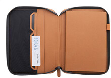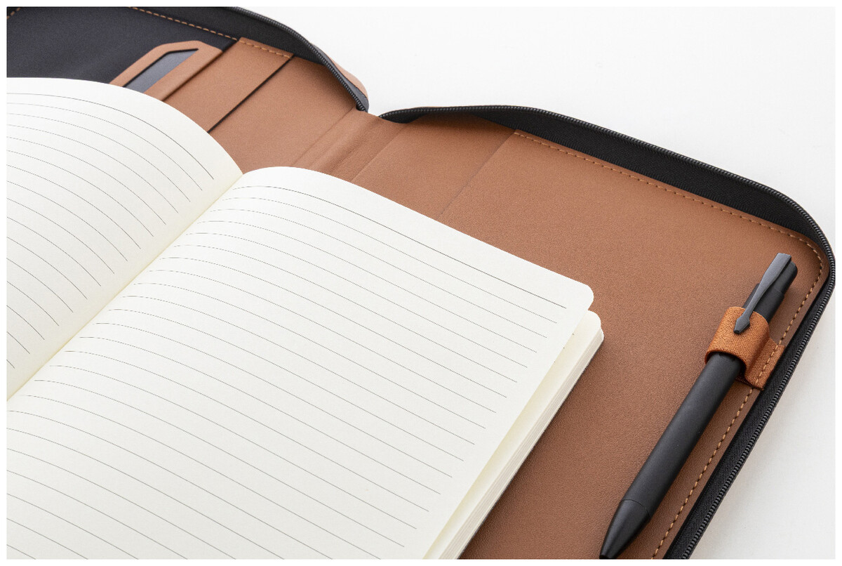 Luxusní složka na dokumenty A5 na zip z recyklované umělé kůže s 64 linkovanými listy a blokem z recyklovaného papíru. S několika vnitřními kapsami na karty a dokumenty.