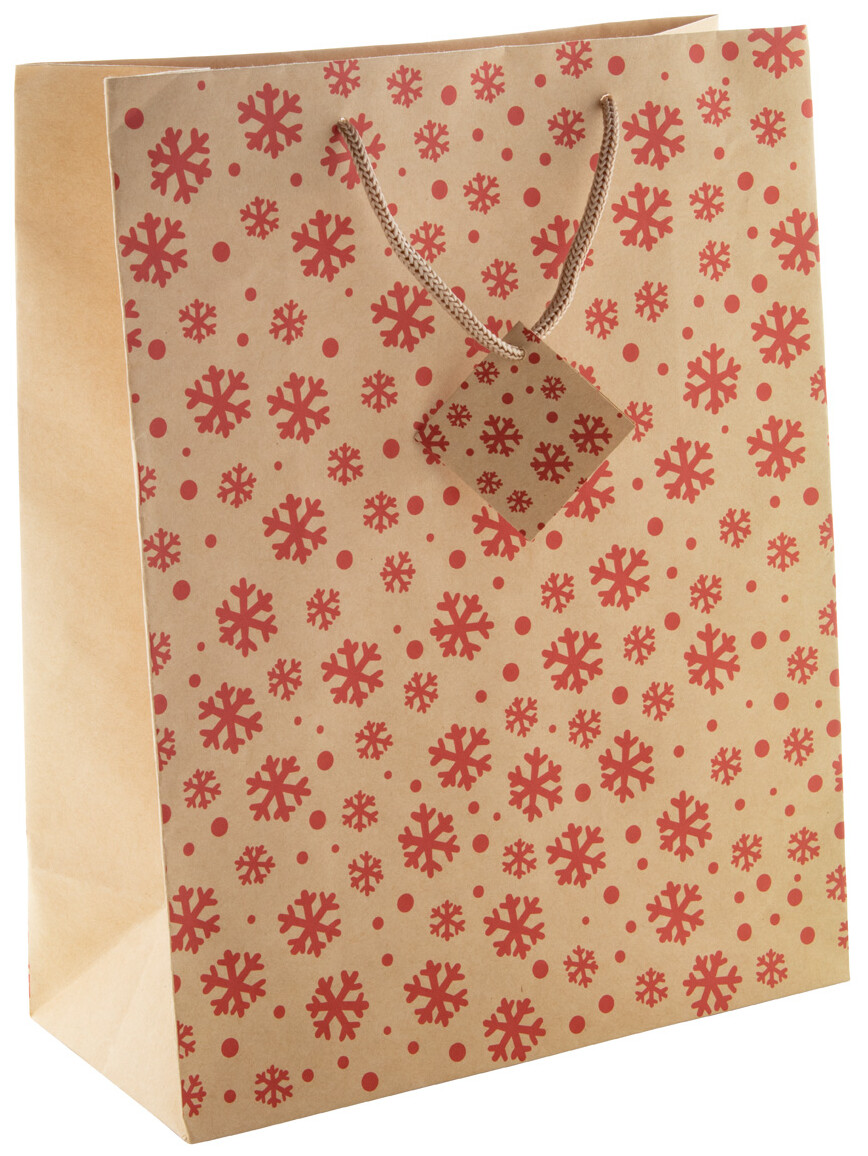 Dárková taška z kraftového papíru s vánočním designem a visačkou.