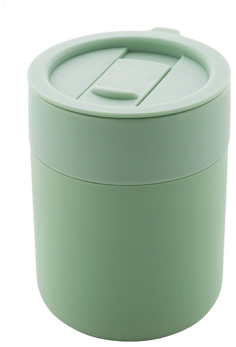 Silikonem potažený keramický cestovní kelímek s PP plastovým odkapávacím víčkem. 300 ml.