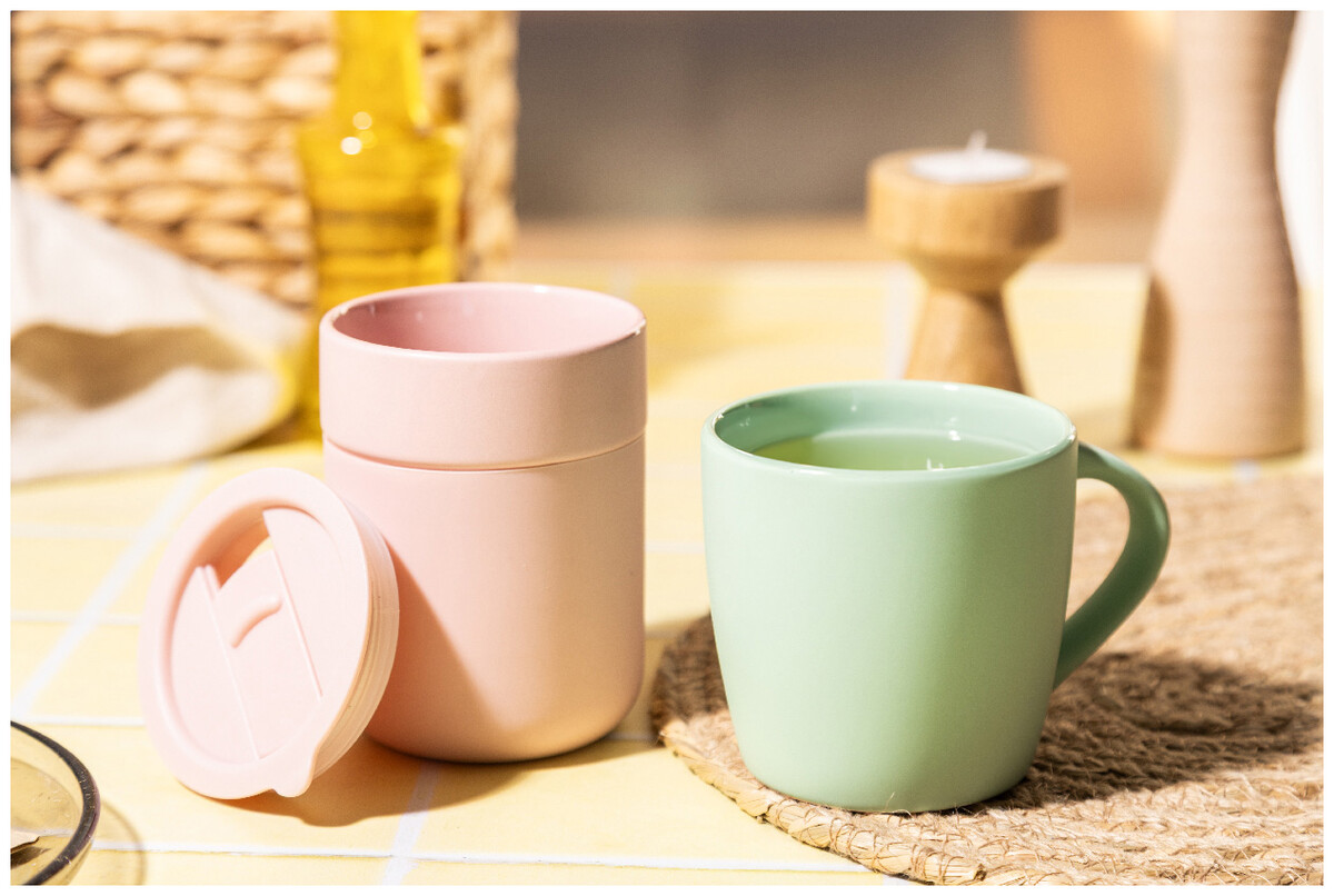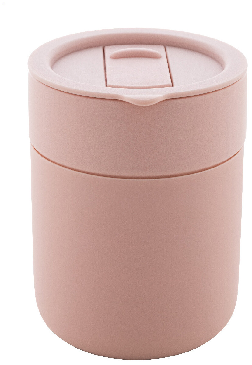 Keramický cestovní kelímek potažený silikonem s víčkem na pití z plastu PP. Objem 300 ml.