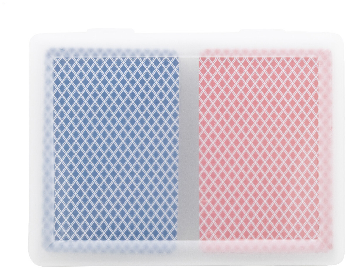 Sada papírových francouzských hracích karet v krabičce z recyklovaného PP. Obsahuje dva standardní balíčky po 54 kartách s červenou a modrou zadní stranou.