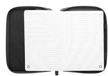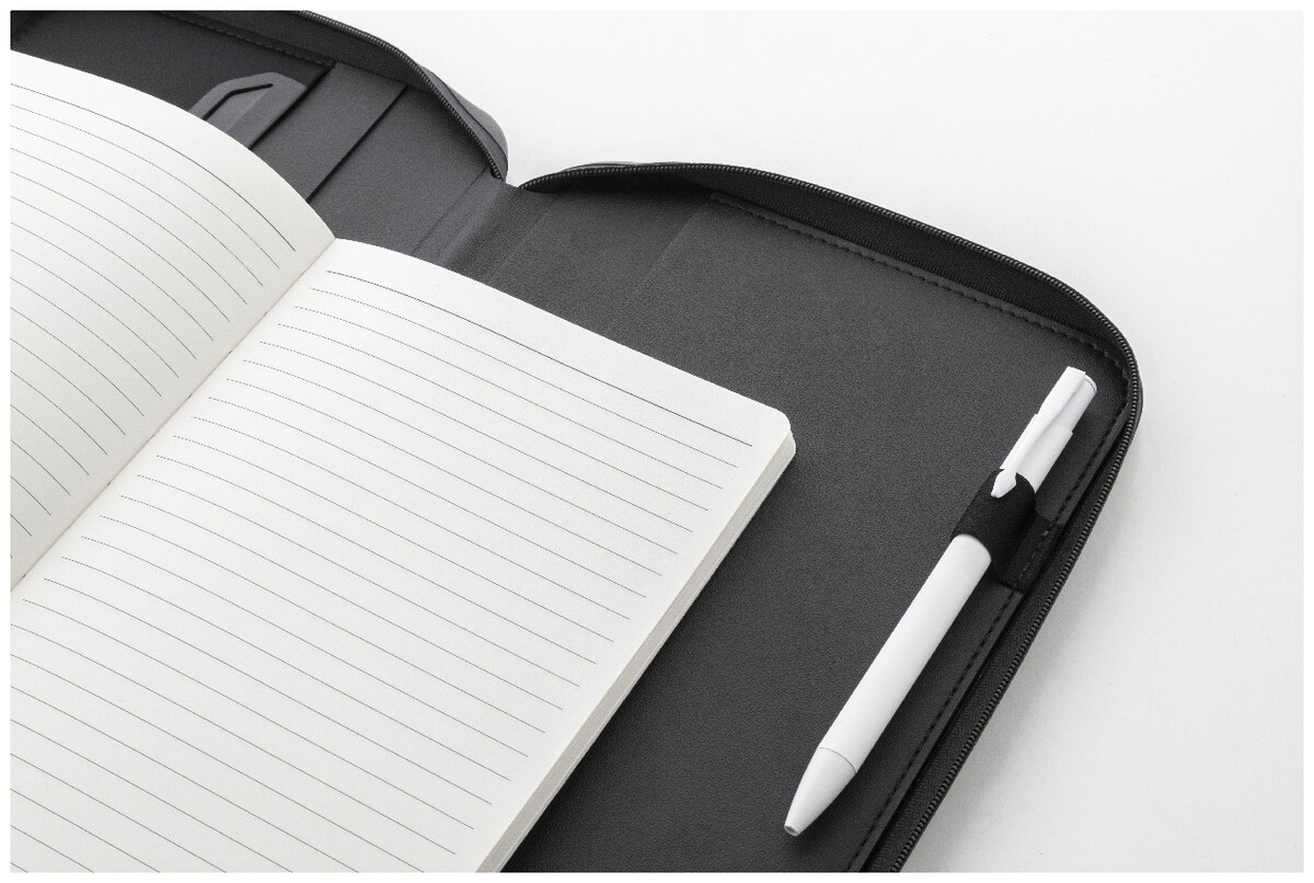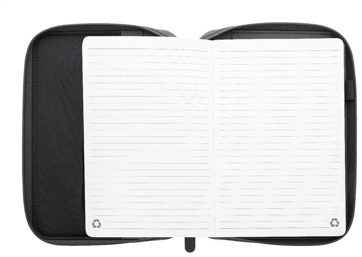 Luxusní složka na dokumenty A5 na zip z recyklované umělé kůže s 64 linkovanými listy a blokem z recyklovaného papíru. S několika vnitřními kapsami na karty a dokumenty.