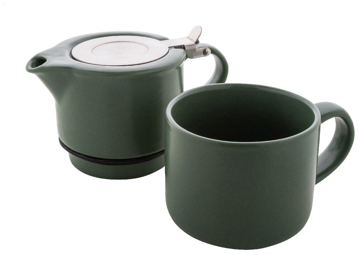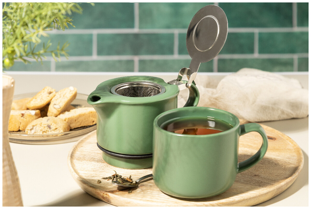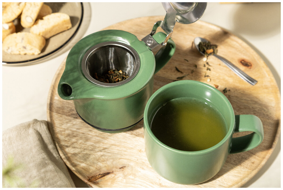 Vysoce kvalitní keramická čajová sada s matným povrchem. Včetně konvice na čaj (430 ml) s víčkem z nerezové oceli a sítkem na čaj, navržená pro úhledné stohování na odpovídající hrnek (400 ml). V krabičce z kraftového papíru.