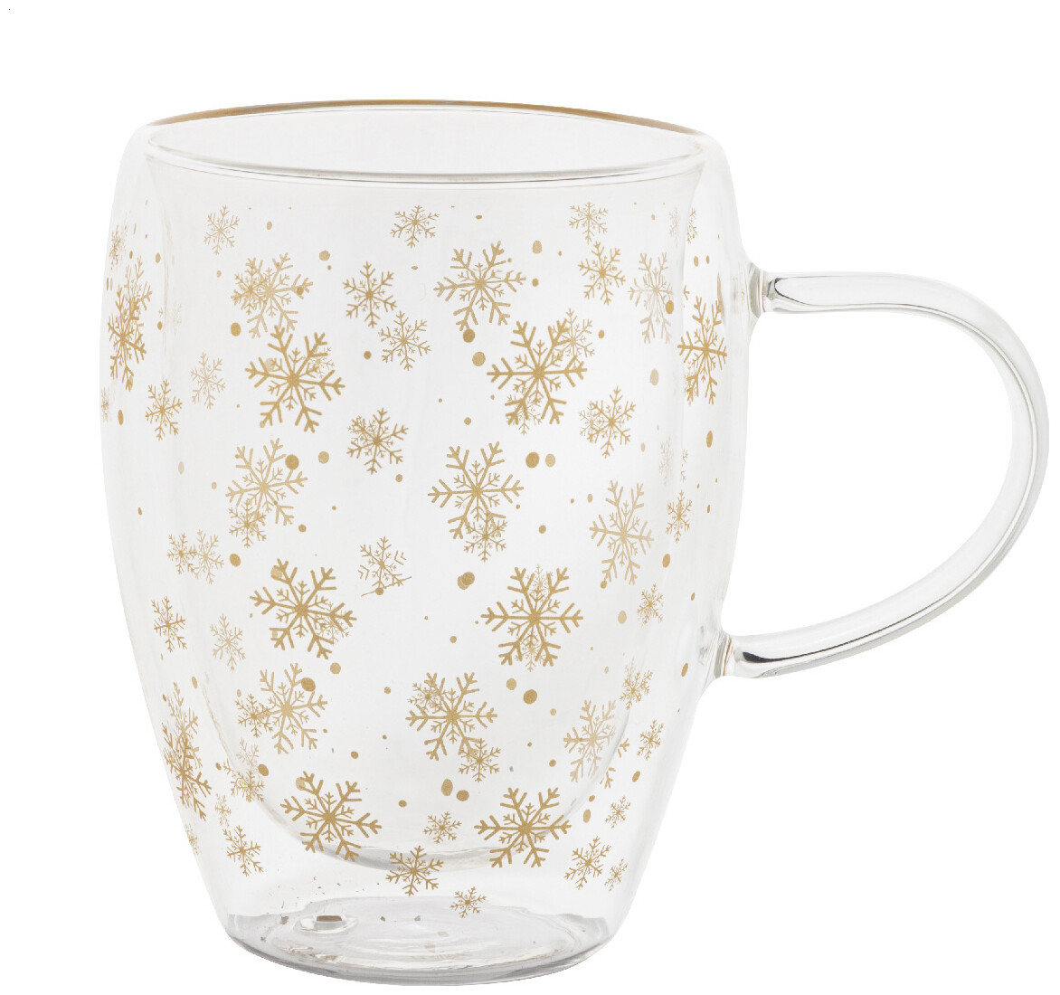 Dvoustěnný termohrnek z borosilikátového skla s motivem vánočních sněhových vloček, 350 ml. V krabičce z kraftového papíru.